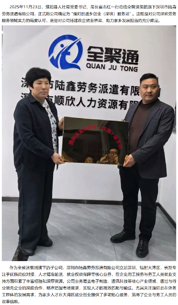 喜讯!“濮阳县返乡创业(深圳)服务站”落户深圳市陆鑫劳务派遣有限公司